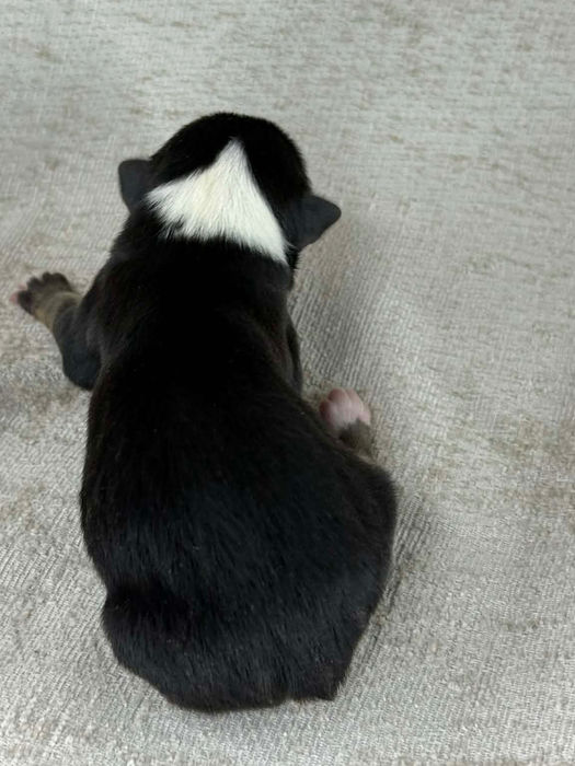 This stunning Black Tri Male is nothing like we've ever raised before. His deep, rich, and dark legs are completely opposite to the tall white stockings we are used to! He will turn heads for sure. We can't wait to see how he matures in the next 8 weeks. What a fun colored pup! Knight has a docked tail and dew claws have been removed.